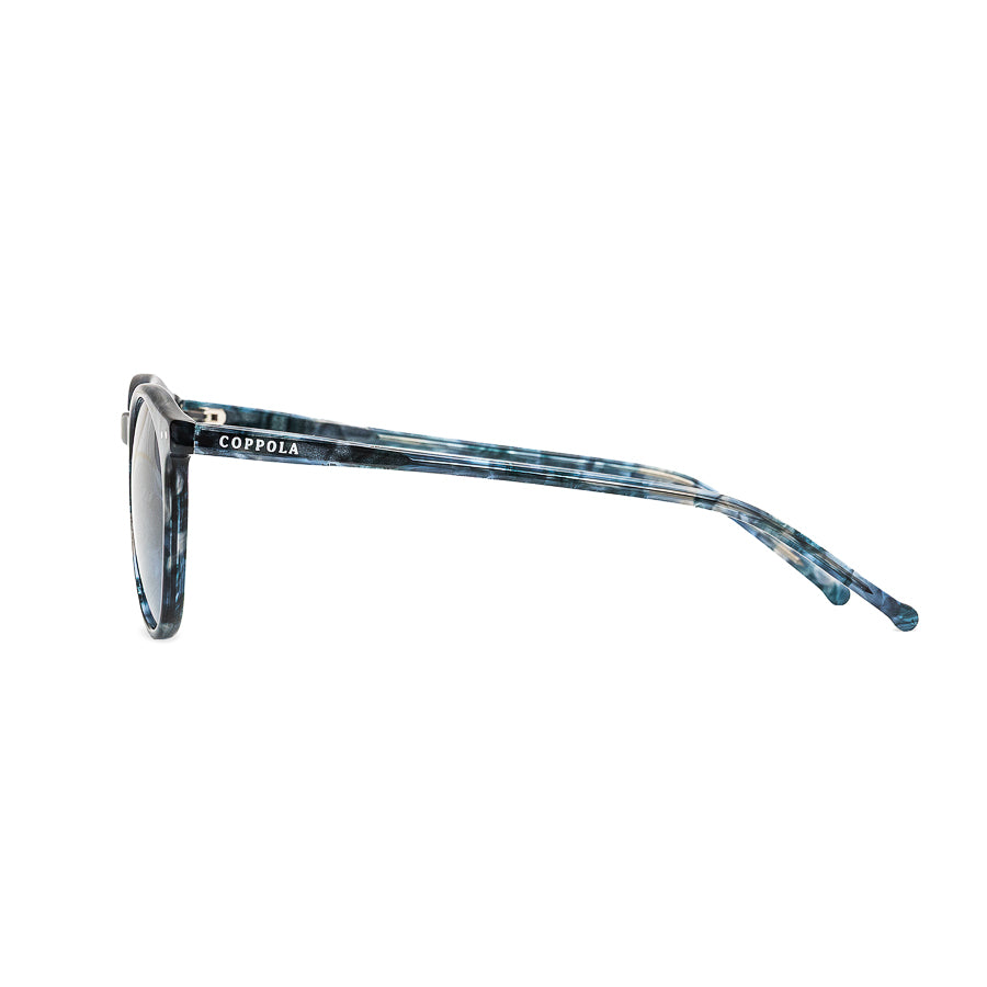 Acetato italiano pulido a mano. Patillas en acabado plata. Lentes con protección UV400. Ensamblado artesanal en series ultra-cortas.